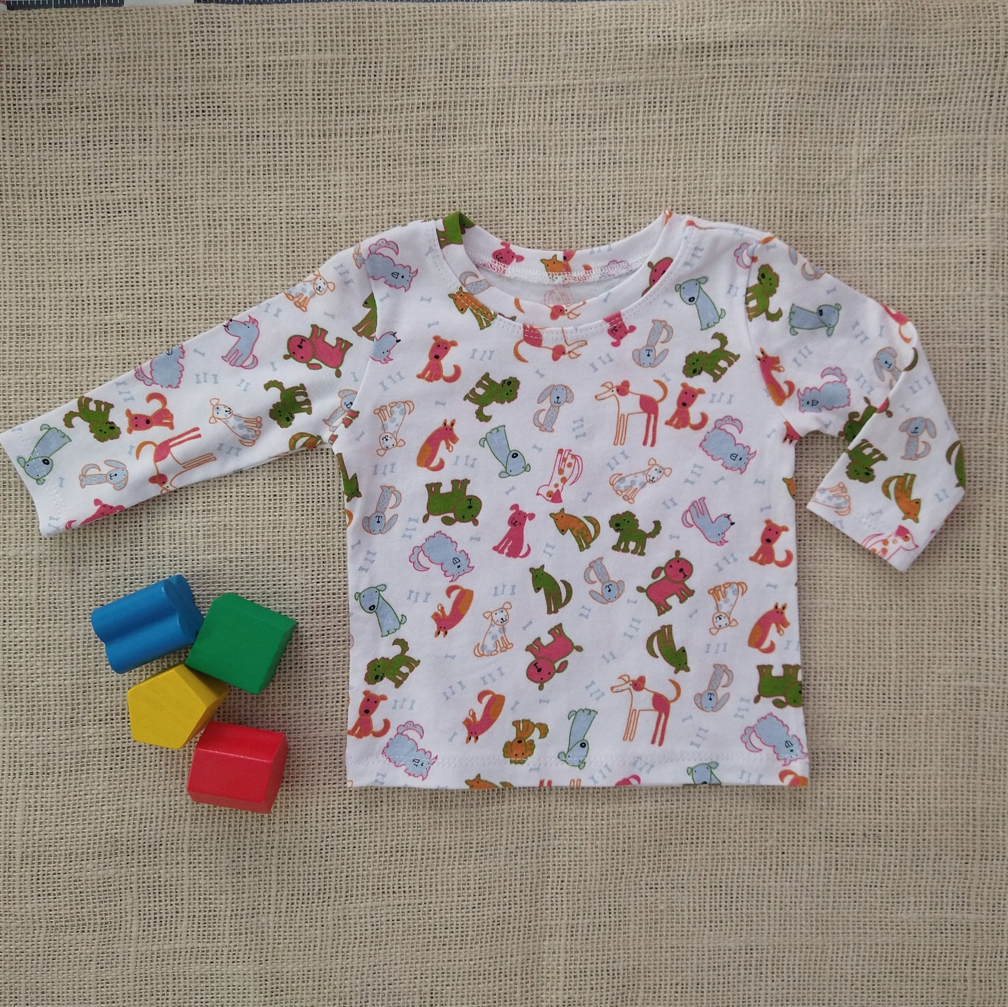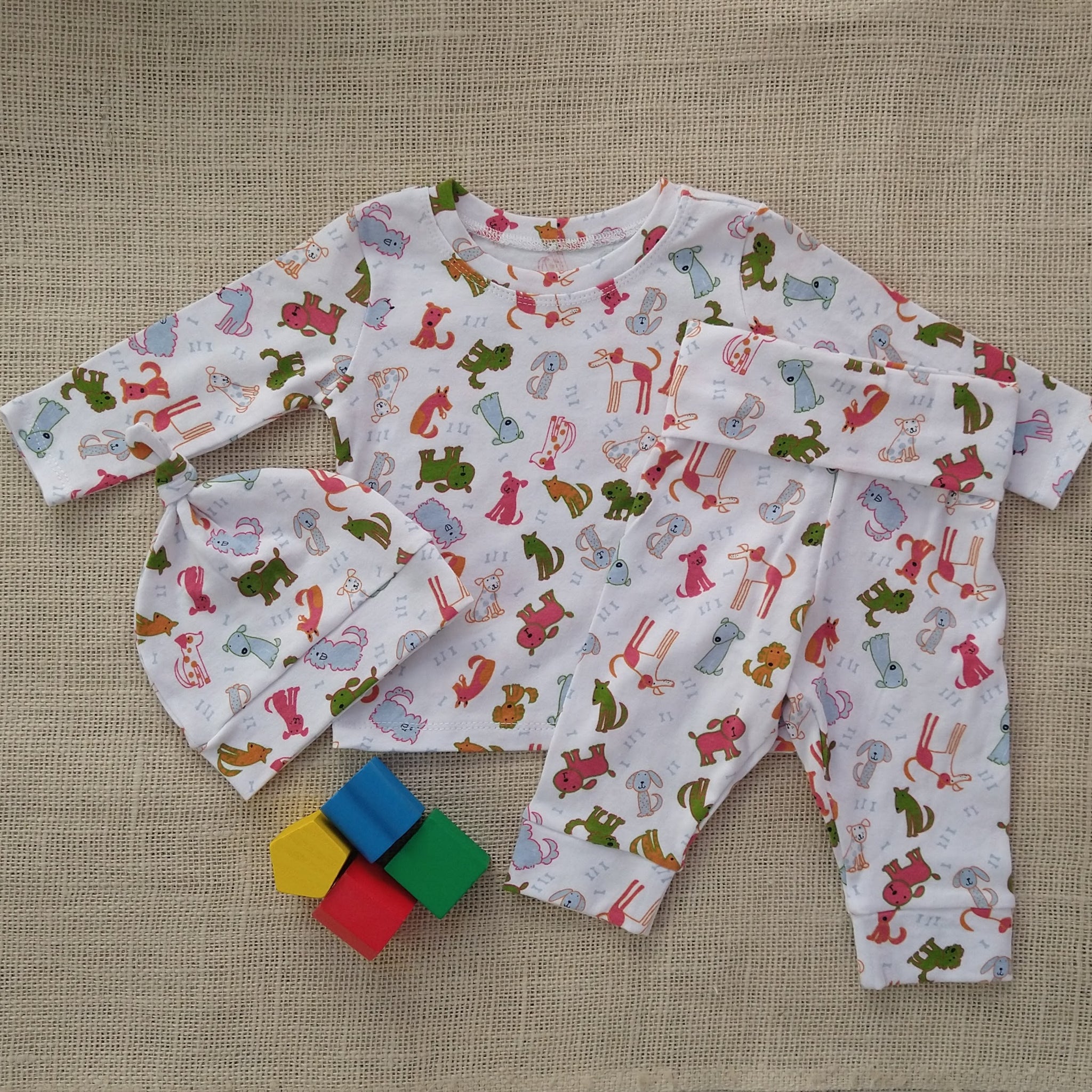 This adorable baby long sleeve top & pants & hat set is made of soft printed stretch cotton jersey knit. It features a smooth hand and about a 25% four-way stretch for added comfort and ease.